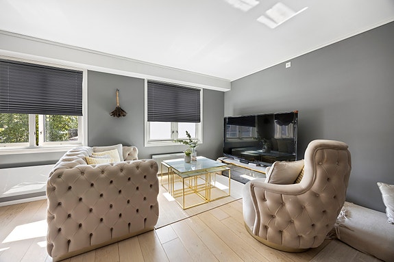 Leiligheten oppleves som lys og luftig, med en romslig stue som gir flere muligheter for møblering og innredning etter eget ønske. Det store soverommet har direkte adkomst til badet, noe som gir en praktisk og komfortabel løsning i hverdagen.
