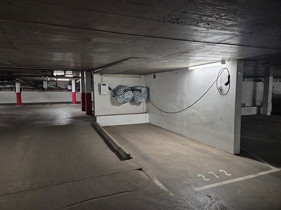 Romslig parkeringsplass i et innendørs, oppvarmet garasjeanlegg selges. Parkeringsplassen har montert elbillader/ladeboks og veggstativ for dekk. Plassen har ingen parkeringsplasser ved siden av seg, og er enkel å kjøre inn og ut av. Denne parkeringsplassen har en unik bruksrett til parkeringsplass som tillater bruk/kjøp av parkeringsplassen uten å være seksjonseier i sameiet. Plassen kan leies ut.