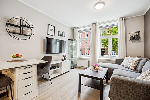 Leiligheten har en effektiv planløsning med entré, stue med åpen kjøkkenløsning, sovealkove og et delikat bad. Den ble oppusset i 2017 og har et stilrent Norema-kjøkken med integrerte hvitevarer. Store vindusflater gir leiligheten et luftig og åpent uttrykk, og sørger for rikelig med lys. I kjeller finner du en romslig bod med god lagringsrom.
