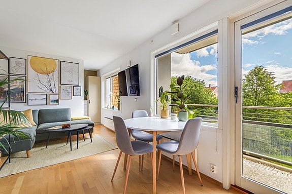 Planløsningen er smart og åpen, og de store vindusflatene gir masse naturlig lys. Stuen har utgang til en koselig balkong, perfekt for morgenkaffen, rolige kvelder eller små sammenkomster med venner.