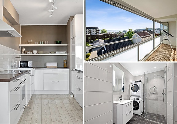 Fra stuen er det utgang til balkong på 11,5 kvm med nydelig sjøutsikt. Boligen har i tillegg 3 romslige soverom og praktisk gang.