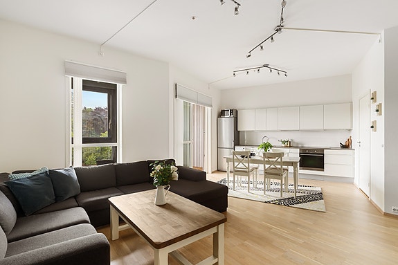 Listefrie overganger og parkett på gulvet er gjennomgående, og leiligheten holder en god standard.