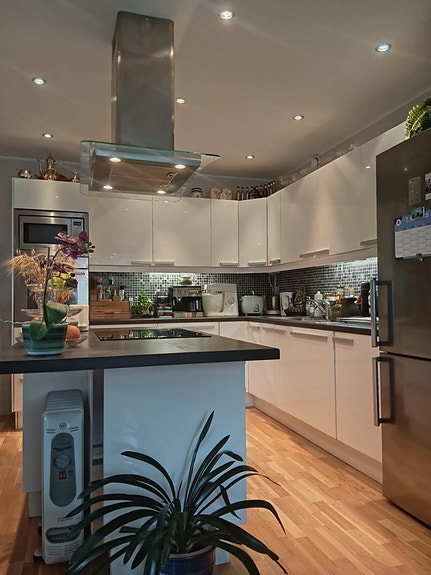 Kjøkken har åpen løsning til stue. Standard over middels i borettslaget, og har største bad i disse blokkene.