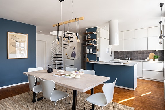 Grünerløkka | Lys og luftig toppleilighet over to etasjer med innholdsrik planløsning. Balkong og terrasse. Peis.
