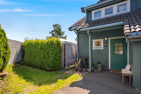 Familievennlig og lettstelt enderekkehus m/skjermet terrasse på 32m² og hageflekk - Carport m/elbillader og utvendig bod
