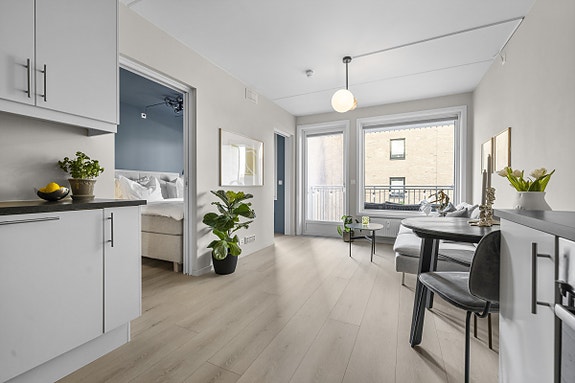 Leiligheten inneholder en romslig entré med skyvedørsgarderobe, et delikat bad, en fin stue/kjøkkenløsning med sone for både spisestuemøbler og sofaavdeling. Fra stuen er det utgang til vestvendt balkong på 6.5 m² med fine solforhold.