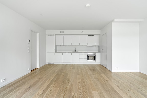Leiligheten har en åpen og effektiv planløsning med to gode soverom, moderne kjøkken med integrerte hvitevarer, flislagt bad og rikelig med lagringsplass - både innvendig og i egen sportsbod.