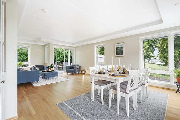 Stuen har god plass til både spisestuemøblement og sofagruppe. Store vindusflater slipper godt med dagslys inn.