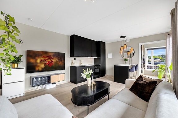 Leiligheten må sies å ha en av Solsidens beste beliggenheter; her ligger du vestvendt til i 8. etasje med glimrende sol- og utsiktsforhold, og store vindusflater bidrar til den luftige og helt spesielle atmosfæren.