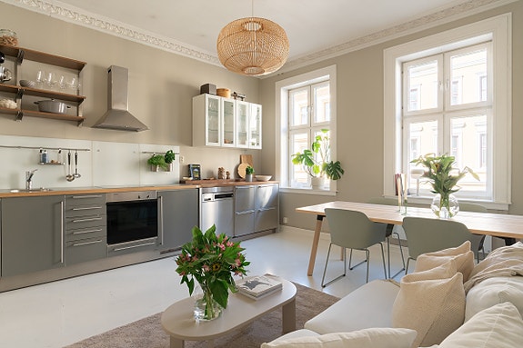 Dette er en nydelig, gjennomført leilighet med klassiske detaljer som generøs takhøyde, store vindusflater, stukkatur og rosett. Boligen holder en god standard og fremstår som velholdt. Planløsningen gjør at samtlige rom oppleves som luftige og skaper en behagelig romfølelse.