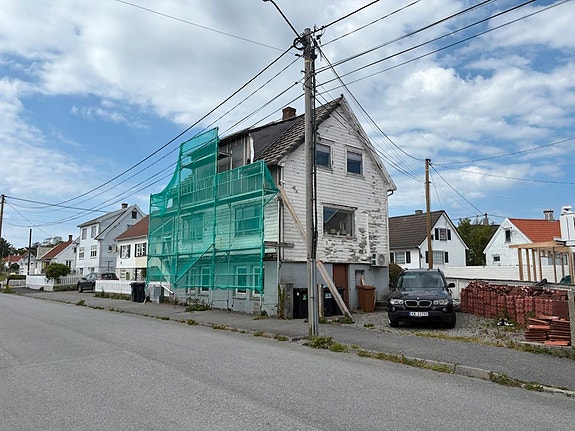 Huset er påbegynt restaurering på veggen mot sør og takside mot sør.