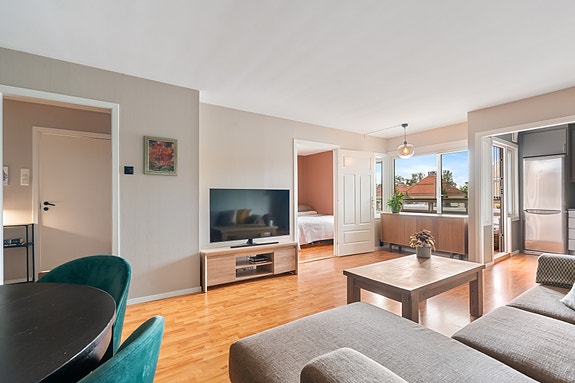 Lys & pen 2-roms leilighet. Solrik & innglasset balkong på ca 9 kvm. Heis, garasjeplass og varmtvann inkludert!