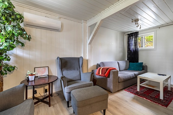 Hyggelig stue med lyse farger og fint gulv. Varmepumpe er nylig montert.