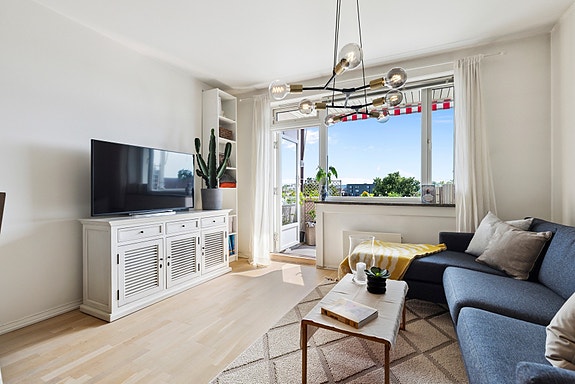 Romslig og innbydende 2-roms toppleilighet med solrik, sydvestvendt balkong. V.v. og internett inkl. Super beliggenhet!
