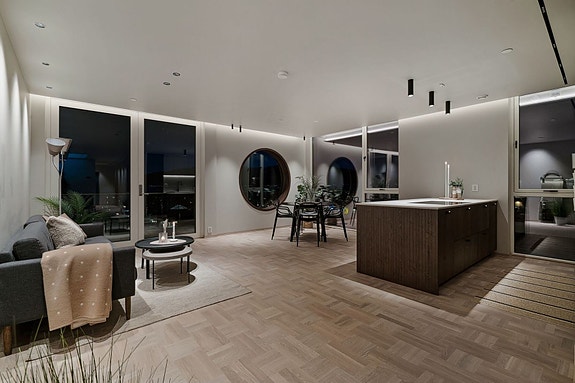 Her blir du møtt av et moderne og innbydende interiør med fokus på detaljer og materialvalg. De store vinduene slipper inn rikelig med naturlig lys, noe som skaper en luftig og behagelig atmosfære.
