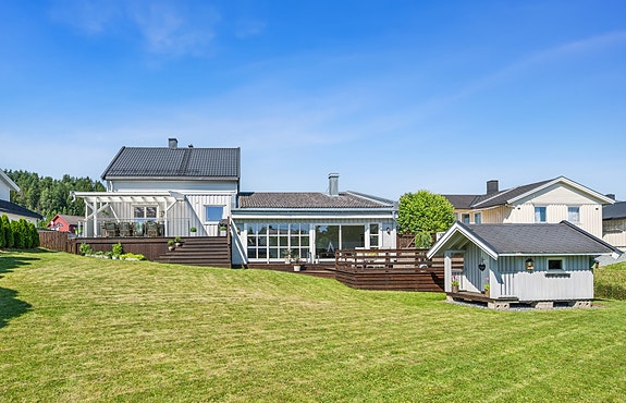 Velkommen til en innholdsrik og pent opparbeidet eiendom med enebolig, dobbelgarasje og stor, solrik tomt! Boligen har flere gode uteplasser, inkludert to terrasser - én overbygget med spiseplass og én med jacuzzi (kan medfølge for kr 45.000,-). Hagen er romslig og skjermet, med gressplen, prydbusker og kjøkkenhage.