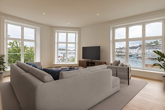 Romslig og herskapelig 3- roms leilighet midt i hjertet av Risør sentrum! Store vindusflater med fantastisk utsikt mot havnen.