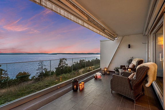 Vestvendt balkong på 16 kvm - ta enkelt med morgenkaffen, lunsj eller middag ut. Balkongen har plass til både lounge- og spisemøblement, med uforstyrrede solforhold og fantastisk fjordutsikt.