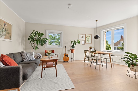 Lys og lekker 2-roms topp- og hjørneleilighet | Solrik balkong og utsikt | Peisovn | Rolig og attraktiv beliggenhet!