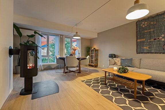 Lekker 4-roms endeleilighet - Balkong - Oppusset i 2023 - Bad fra 2020 - Garasjeplass m/lader - Peisovn - Varmepumpe!