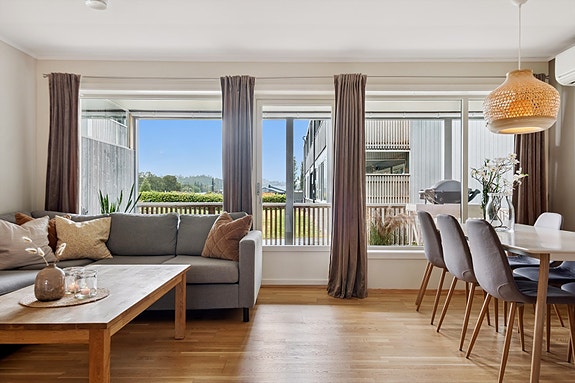 Leiligheten holder en gjennomgående god standard fra 2012 med parkettbelagte gulv, flislagt bad og vaskerom. Stuen ligger i åpen løsning til kjøkken/spisestue og har utgang til veranda. Kjøkkeninnredningen har integrerte hvitevarer, godt med skap og benkeplass og har fått tilstandsgrad 1 fra takstmann.