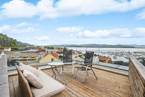 Leiligheten i Langgaten 25A ligger idyllisk plassert nede på brygga i Holmestrand, rett ved fjorden. Et lekkert bygg, oppført så sent som i 2021, med god standard og flott fellesområde. Leiligheten ligger høyt og fint i 5.etg og har flott fjordutsikt innendørs og utendørs. Med leiligheten følger en sydvendt balkong på 13m², samt privat parsell på ca.15m² på taket. Her kan du virkelig nyte lange og solrike dager med beroligende utsikt.