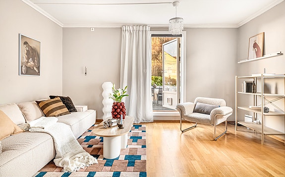 Stilfull og påkostet 2-roms i funkisgård med vestvendt stue og designkjøkken. Oppgradert bad.