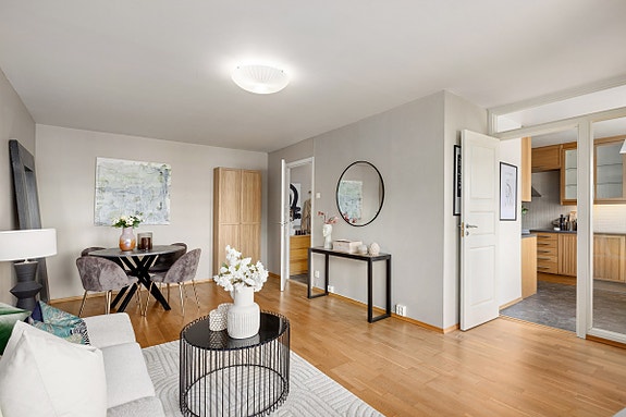 Leiligheten har en praktisk planløsning med et romslig soverom med plass til dobbeltseng og garderobeløsning, stue med god plass til en sofagruppe og spisebord og utgang til en balkong på 9 kvm, samt et separat kjøkken med adkomst fra både stuen og gangen.