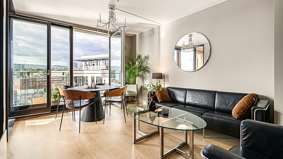 Eksklusiv 3-roms i 8 etasje med garasjeplass, sjøutsikt og balkong. Felles takterrasse