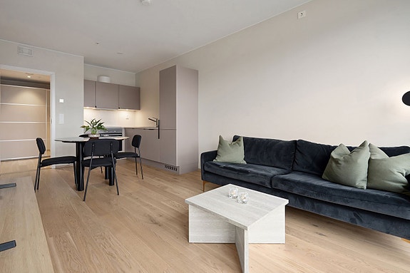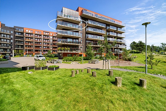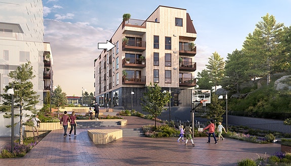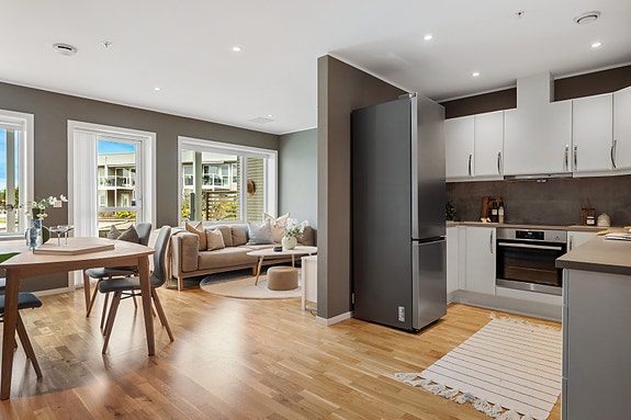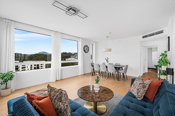 Innbydende og tidsriktig 4-roms leilighet. Beliggen på enden i bygget 5. etasje. Heis og trappefri tilkomst fra hovedinngang og garasjeanlegget hvor leiligheten har sin egen garasjeplass. Leiligheten har gjennomført og moderne stil som kombinerer bokomfort, kvalitet og funksjonalitet på én og samme flate. Privat terrasse på hele 23 m² med gode solforhold og utsikt over nærområdet + enkel tilgang til felles takterrasse. Fine fellesareal.