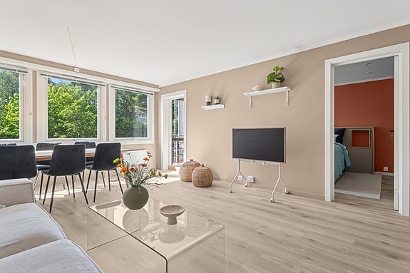 Velkommen til Heimdals gate 7 og denne romslige 2-roms leiligheten beliggende i 4.etasje. Leiligheten inneholder entré, bad, vaskerom, stue, kjøkken, soverom og innglasset balkong. Her får du slette vegger og gulv med en pen 1-stavs laminat. Badet er nytt fra 2022 og er delikat og moderne. I tillegg får du et praktisk vaskerom. Stuen er romslig og har gode møbleringsmuligheter. Store vindusflater slipper inn rikelig med naturlig lys. Fra stuen er det utgang til en flott innglasset balkong. Soverommet er av god størrelse og har en praktisk skyvedørsgarderobe. Leiligheten er malt i tidsriktige farger som skaper et lunt og tidsriktig inntrykk.