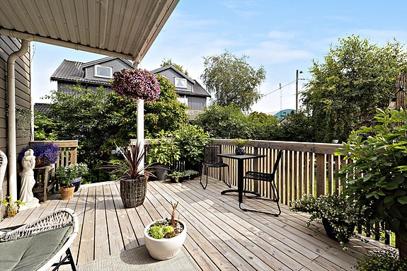 Terrassen på ca. 19 m² har adkomst fra stue og hage, og byr på gode muligheter for utemøbler og hyggelige stunder.