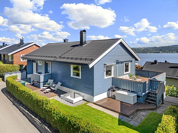 Pen og innbydende enebolig i borettslag. Solrik balkong med flott fjordutsikt. Garasje. Svært barnevennlig boligområde.