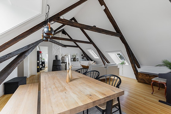 Romslig loftsleilighet med synlige bjelker og god takhøyde midt i Risør sentrum - Parkeringsplass - Ingen boplikt!