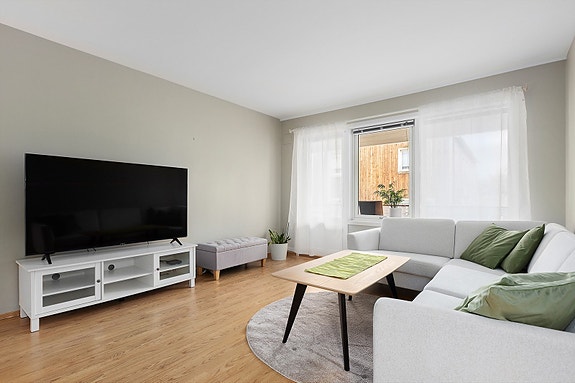 Stor stue med god plass til spisestue. Det er utgang til balkong fra stuen.