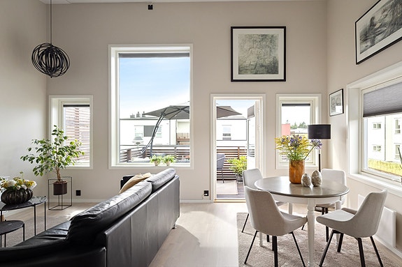 Stilren og solrik 3-roms endeleilighet. Ingen fellesgjeld. Lave felleskostnader. Zipscreen/markise. Carport/el.billader.