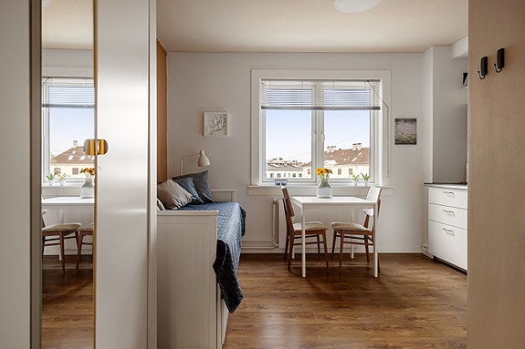 En lys, liten og koselig 1-roms leilighet med god standard. Leiligheten ligger i byggets 3. etasje og har en stor vindusflate som slipper inn fint lys, samtidig som det er lite innsyn. Leiligheten holder en gjennomgående god standard med pent enstavs gulv, moderne kjøkken fra 2014 og flislagt baderom oppusset i regi av brl. i 2014.