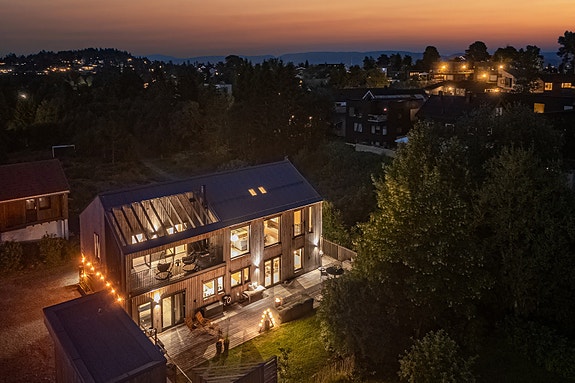 Moderne og innholdsrik arkitekttegnet enebolig. Ny 2022. Fire soverom. Tre bad. Terrasse på 70 kvm. Nært marka.