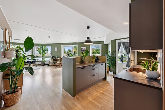 Boligen har en åpen løsning mellom kjøkken, stue og spisestue, er tiltalende og er malt i lyse, tidsriktige farger.