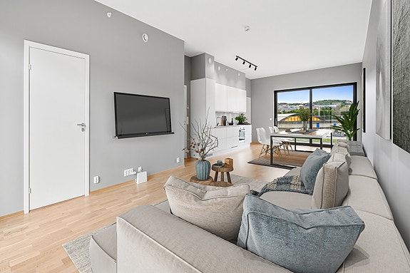 EiendomsMegler 1 ved Markus Tangvik har gleden av å presentere en moderne 3-roms leilighet i Spiltauet 10. Bildet er møblert virtuelt.