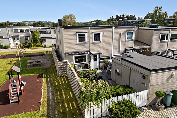 Rekkehuset på 134 kvm går over to plan og består av entré med garderobeskap, vaskerom m/toalett, gjennomgående stue med peis og kjøkken i inngangsetasjen. Oppe ligger fire soverom sammen med badet. Rekkehuset har en god intern beliggenhet på enden, med nydelige uteområder på begge sider av huset. Her er det inngjerdet hage, platting og praktisk utebod. Garasjeplass medfølger også.