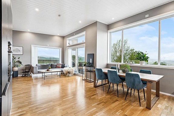 Velkommen til Bjørnangvegen 40! Stue kjøkken har en stor og åpen løsning med store vindusflater og ekstra takhøyde, som gir en svært god romfølelse.