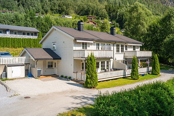 Leilighetsbygget ble oppført i 2007, og denne leiligheten ligger i byggets første etasje. Utenfor inngangspartiet er det opparbeidet med parkeringsplass til to biler, samt at det er felles carportanlegg hvor man har plass til parkering av en bil. I fremkant av leiligheten er det terrasse med god plass til utemøblement.