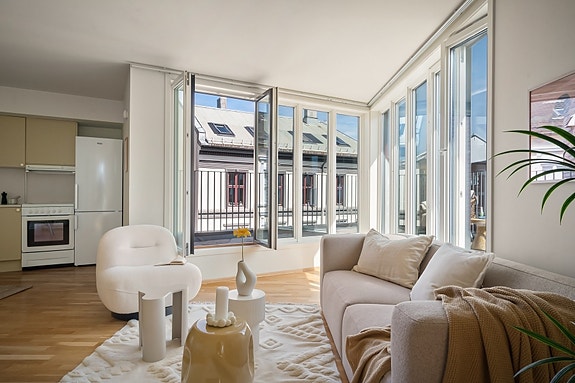 Velkommen til Trondheimsveien 36 - I toppetasje finner du denne unike 2-romsen fra 2002 med 35kvm privat takterrasse og store vindusrekker.