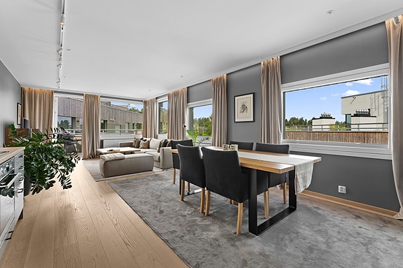 Leiligheten har et stilrent kjøkken med integrerte hvitevarer og en luftig stue med store vindusflater på to sider som slipper inn rikelig med naturlig lys. Videre har leiligheten to delikate bad, ett ved entréen og ett i suiteløsning til hovedsoverommet. Det er tre romslige soverom, hvorav to er innredet med garderobeskap. For ekstra lagringsplass har leiligheten en innvendig bod og en disponibel bod i kjeller på ca. 5 kvm. Det medfølger en garasjeplass med elbillader i felles garasjeanlegg.