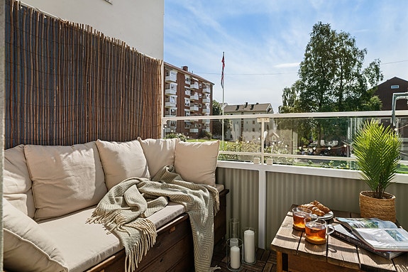 Nydelig balkong med plassbygget sittegruppe som kan utvides