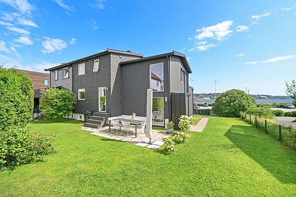 Strøken familieidyll med standard fra 2022, i første rekke mot fjorden med flott utsikt. Betydelig påkostet!