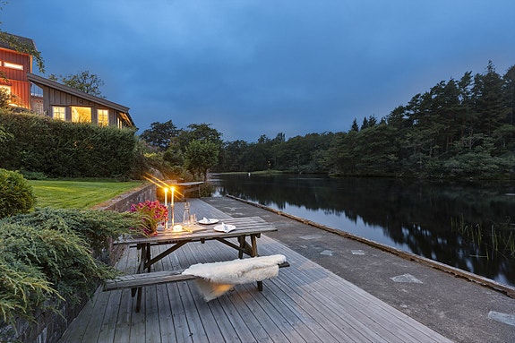 Tilhørende garasje med innredet loft, samt trivelig hagestue ved bryggen som kan brukes hele året.