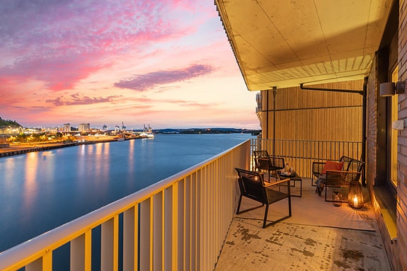 Her kan du nyte sommerkvelder på en overbygget balkong på 13 m² med fantastisk fjordutsikt, eller starte dagen på uteplassen ved inngangen på 6 m². Boligen består av entré, gang, bad/wc, kjøkken, stue og to soverom - alt du trenger for en komfortabel hverdag. Felles takterrasse med panoramautsikt og en stor kjellerbod på 7 m² følger med.