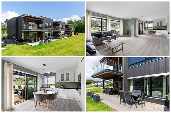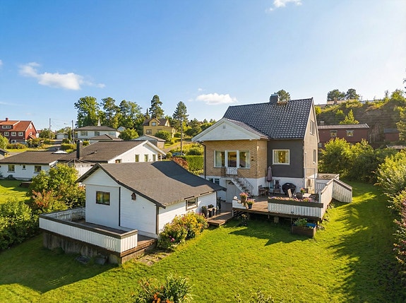Boligen går over to plan, med overbygd terrasse med utgang fra stuen.
